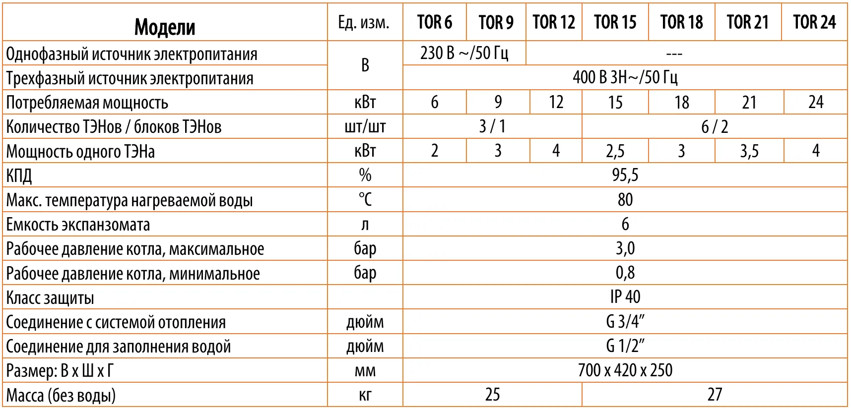 – ВСЕ КОТЛЫ – трёхфазное, 400V~3N/50 Hz.