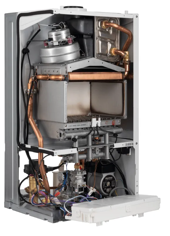 Ключевой элемент котла - это высокоэффективный теплообменник, изготовленный из чистой меди по технологии "Oxygen-Free", что обеспечивает его надежность. Конструкция также включает конденсационный экономайзер для увеличения тепловой эффективности и модулируемую горелку, поддерживающую широкий диапазон мощностей. Надежность и долговечность котла дополнительно гарантируются благодаря гидравлическому блоку, выполненному из качественной латуни.