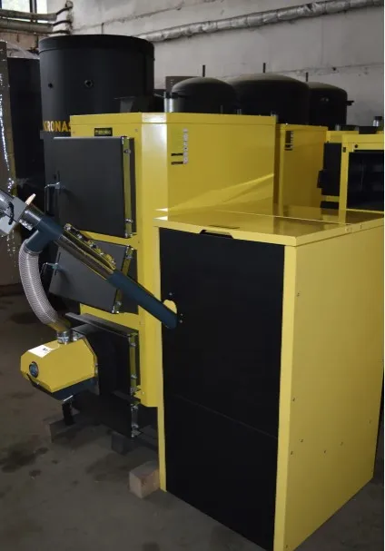 Котел на твердом топливе длительного горения KRONAS PELLETS комплектуется шнековым механизмом подачи топлива, автоматической пеллетной горелкой, электронным контроллером температуры.