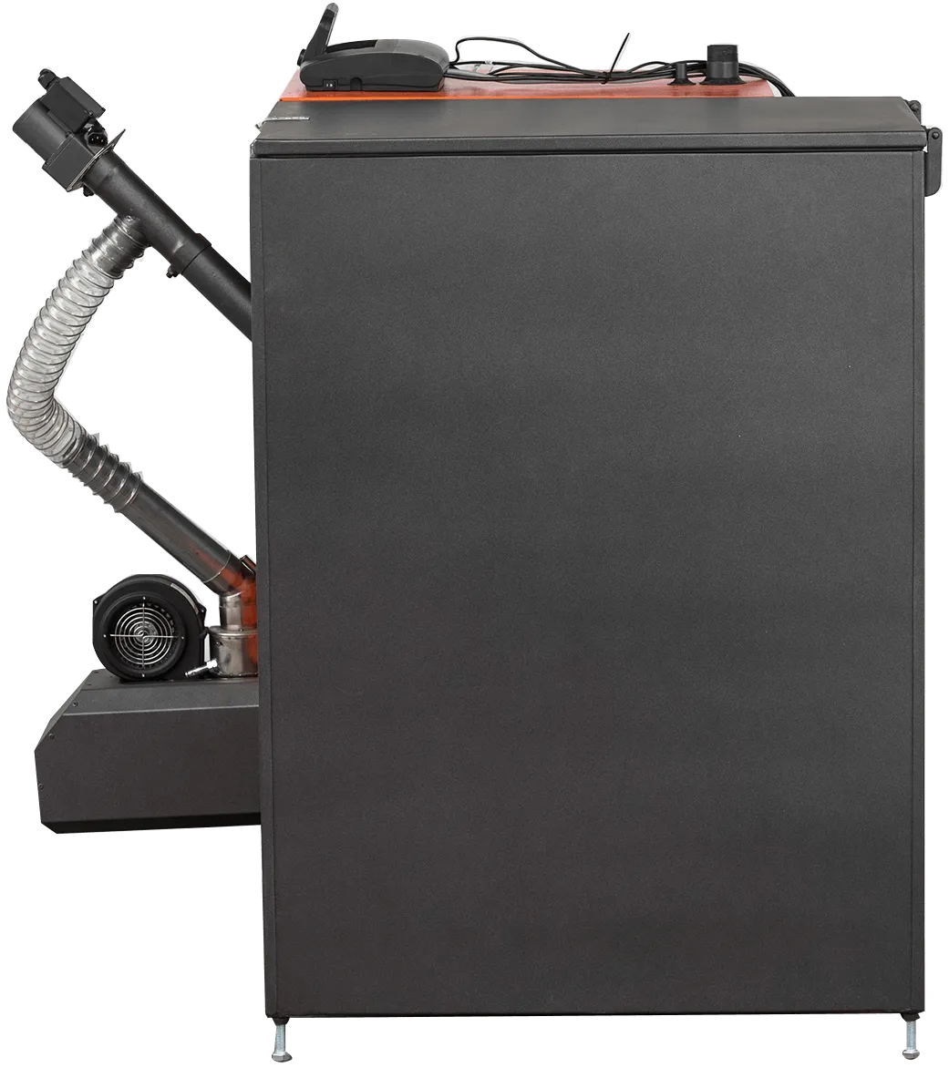 - Котел оснащен горелкой из жаропрочной нержавеющей стали с функцией авторозжига, датчиком пламени и инновационной системой очистки остатков сжигаемого топлива при помощи подвижных колосников, что позволяет работать котлу на абсолютно любом качестве пеллеты;