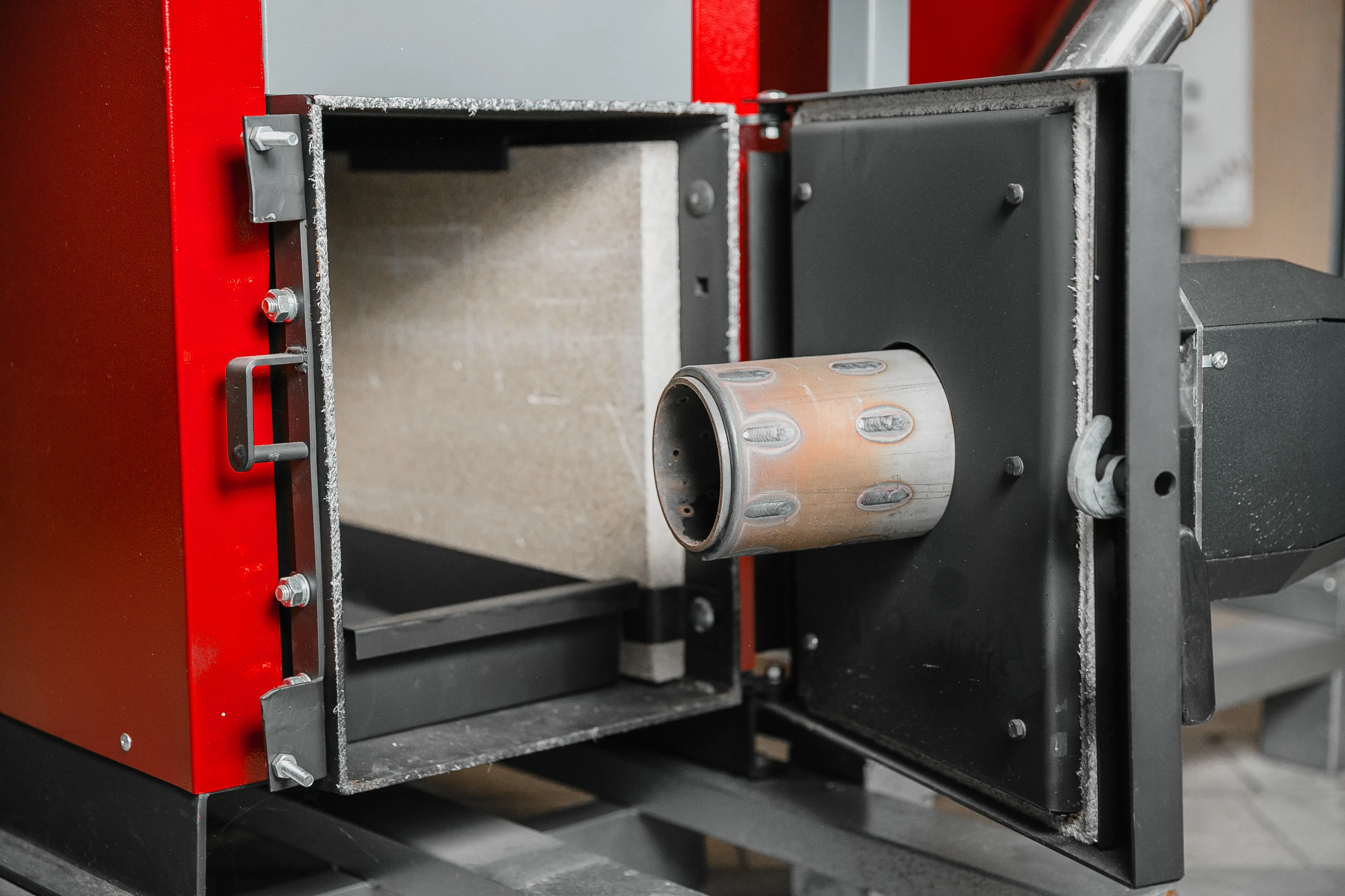Топливо засыпается в большой вместительный бункер объемом 300 литров., который обеспечивает работу котла от 3-х до 7-ми суток. Бункер изготовлен из стали 3 мм., имеет регулируемые ножки и крышку с газовыми амортизаторами. Также котел оснащен подающим шнеком, надежным и экономичным редуктором.